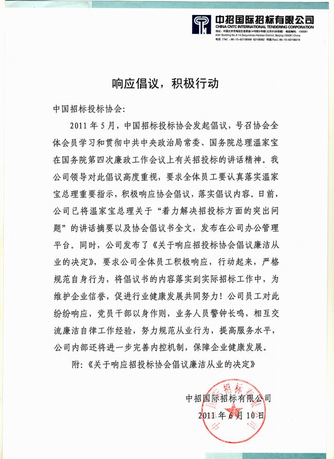 中招国际招标有限公司:响应倡议 积极行动